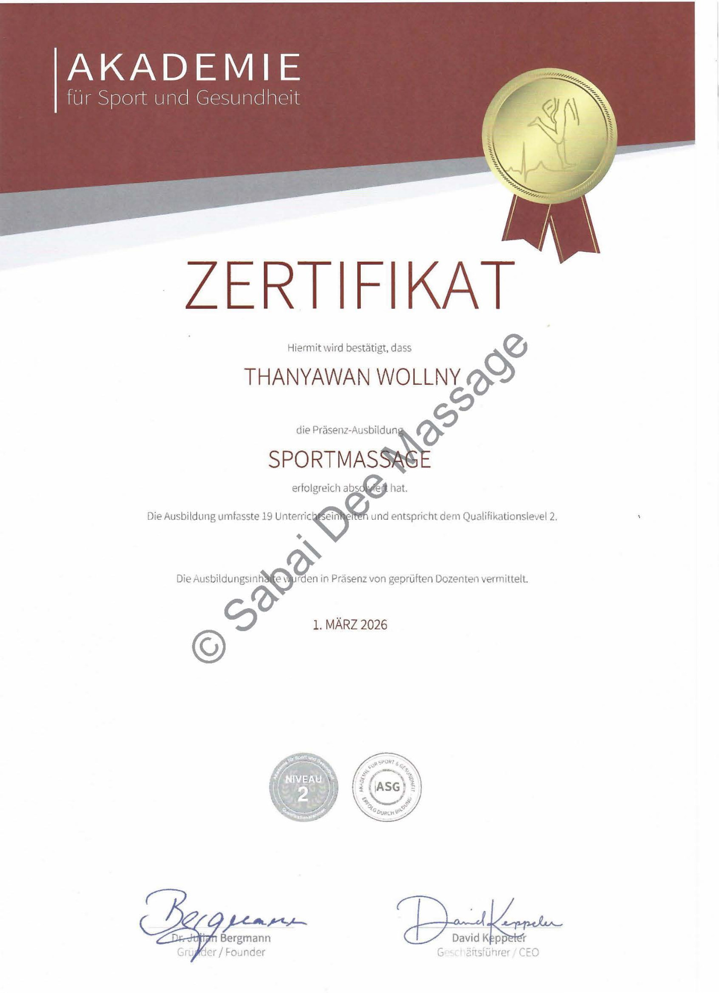 Ihre fundierte Ausbildung absolvierte sie an der renommierten Wat Po Traditional Medical School in Bangkok – einem der bekanntesten Ausbildungszentren für traditionelle thailändische Massage. Zusätzlich nimmt sie regelmäßig an anerkannten Massagekursen und Weiterbildungen in Deutschland teil, um ihr Wissen und ihre Techniken stetig zu vertiefen.